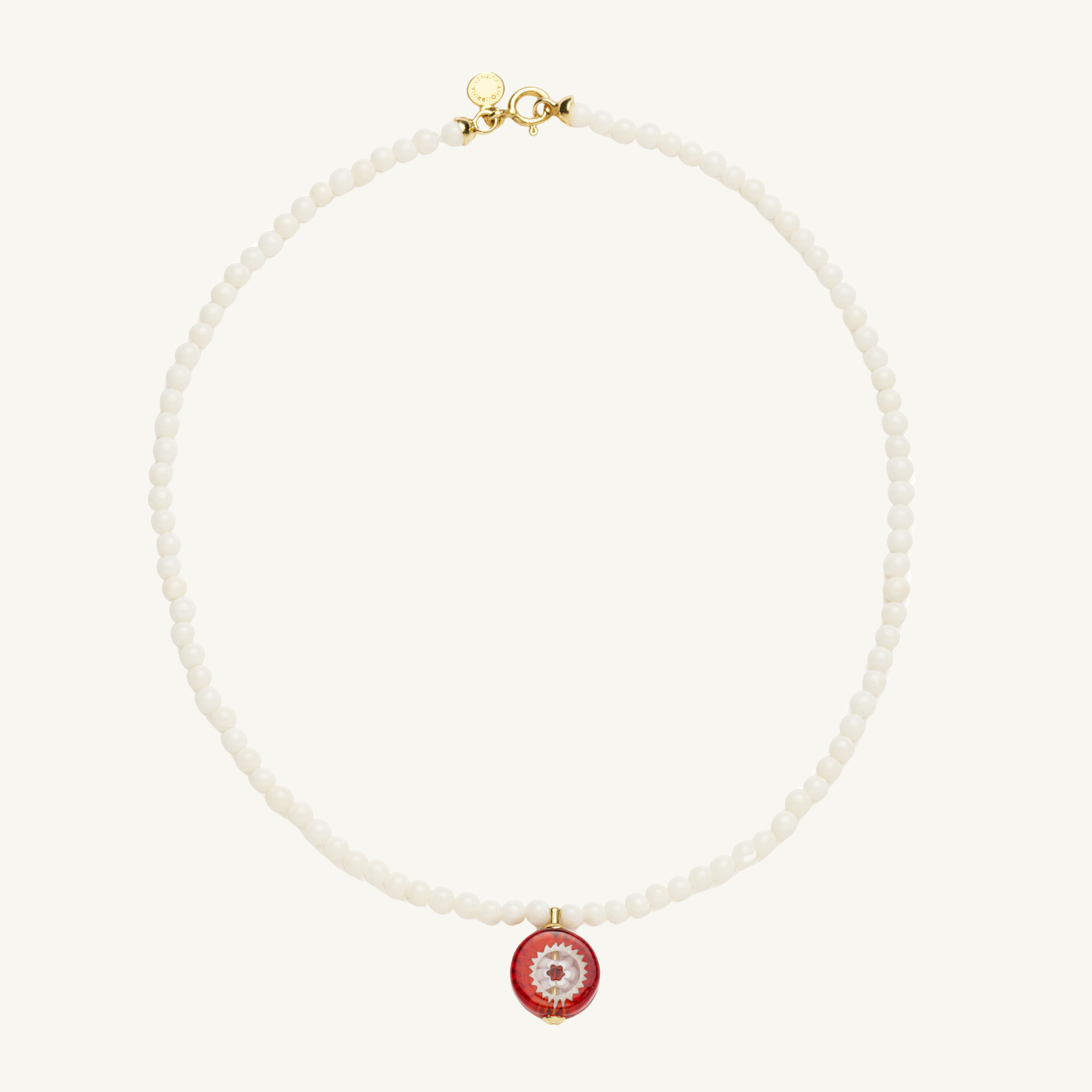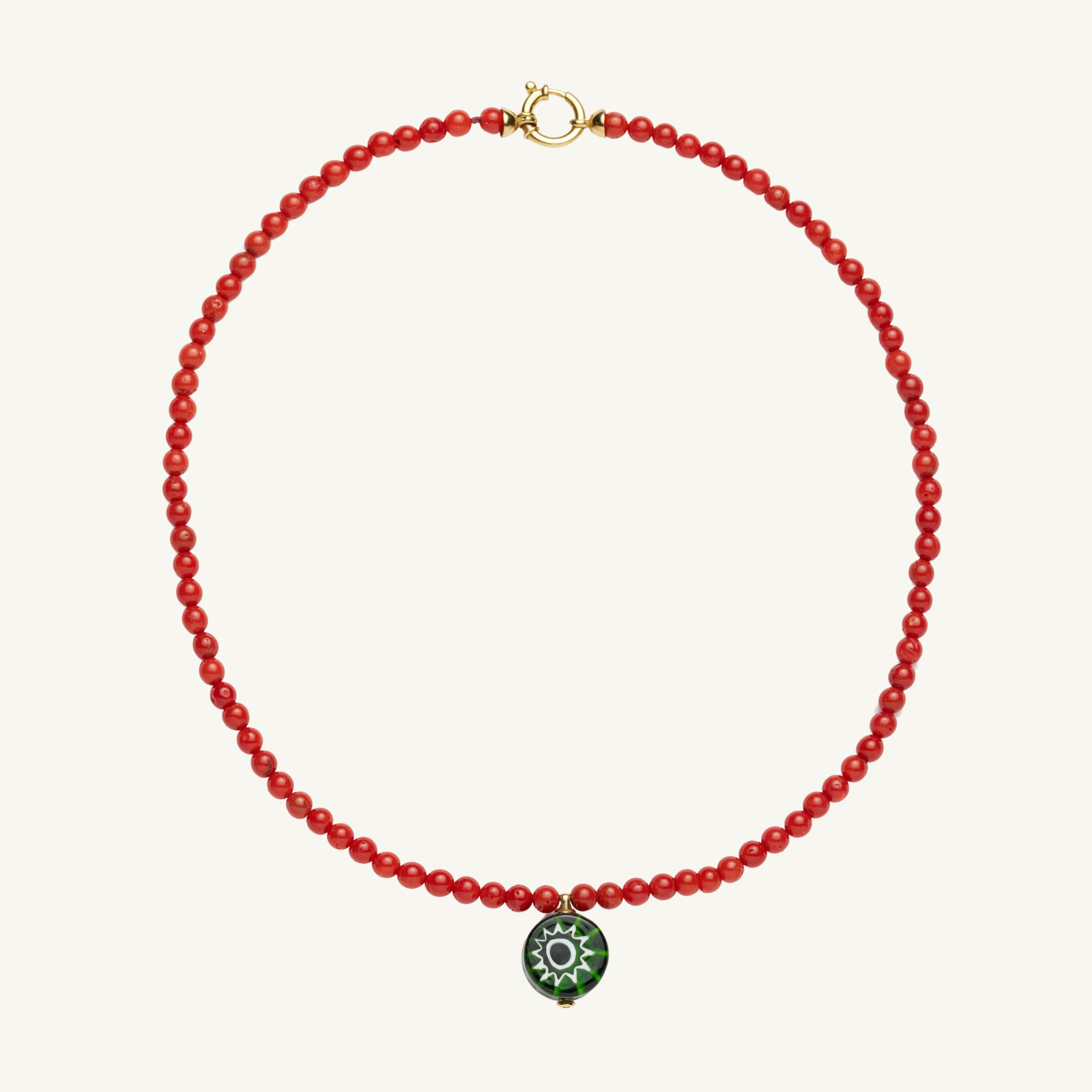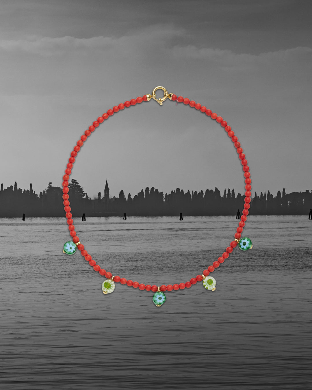 A play of contrasts — deep red coral and vibrant green glass meet in the Fondaco Red Choker. Its name recalls the ancient “Fondaco,” where distant worlds once converged in the heart of Venice.