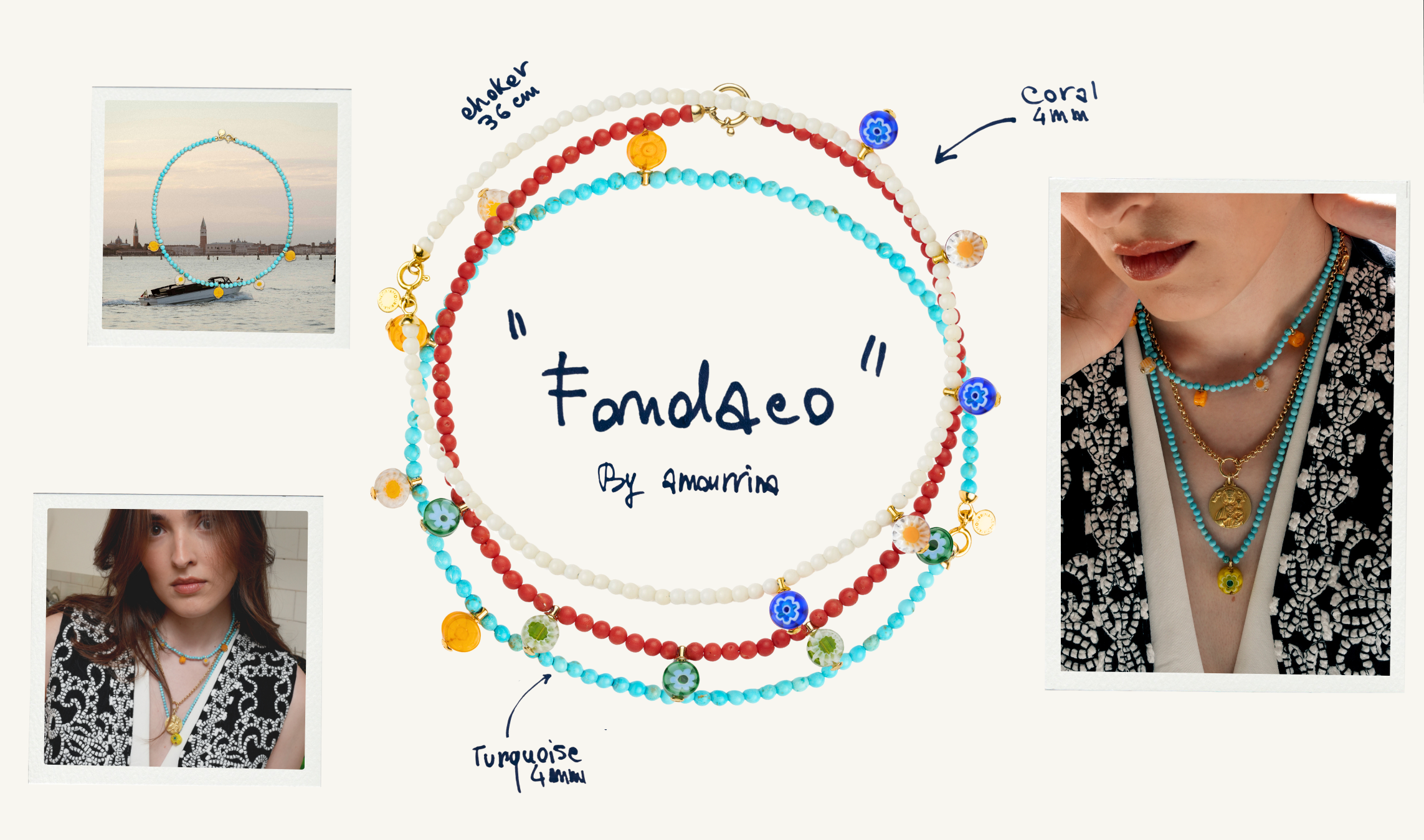 Amourrina celebra le sue perle in vetro accompagnandole a pietre dure e preziose in una collezione che prende il nome dagli antichi centri medievali - i "Fondaco" - in cui a Venezia ci commerciavano i i tesori portati dai mercanti da lontani ed esotici paesi.